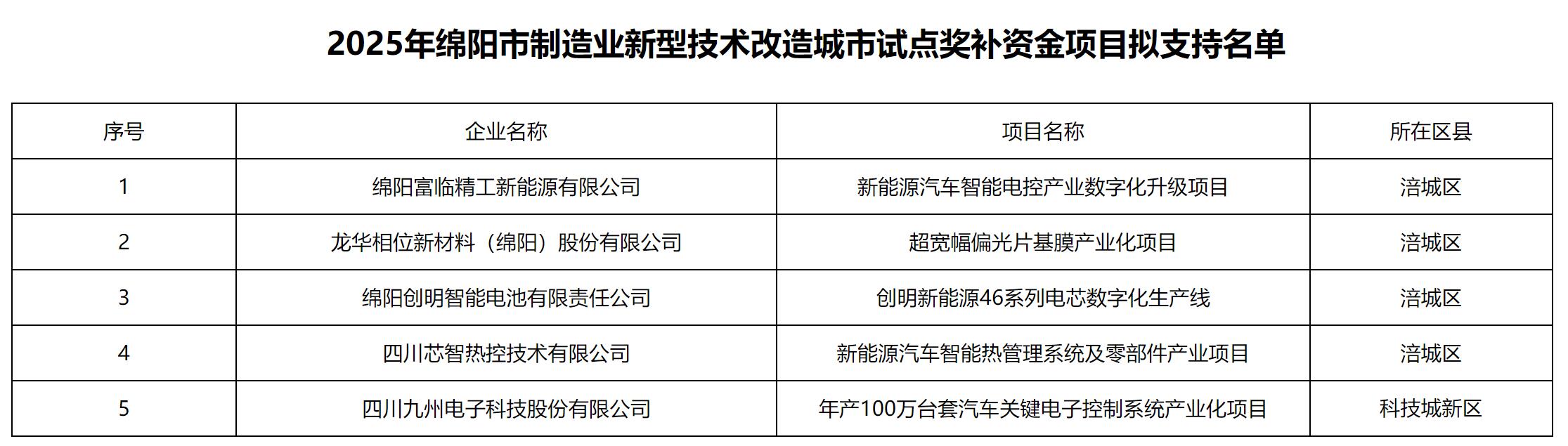 按照《财政部工业和信息化部关于开展制造业新型技术改造城市试点工作的通知》(财建〔2024〕16号)、《工业和信息化部办公厅财政部办公厅关于开展第二批制造业新型技术改造城市试点工作的通知》(工信厅联规函〔2025〕108号)、《工业和信息化部关于2025年制造业新型技术改造城市试点实施方案的批复》(工信部规函〔2025〕122号)和《2025年绵阳市制造业新型技术改造城市试点实施方案》要求,通过企业自主申报,县(市、区)、园区工业经济主管部门初审推荐,经相关科室审核、专家评审、现场核实、征求相关行业主管部门意见和市经信局党组会审议等程序,现对拟支持的5个项目名单予以公示。