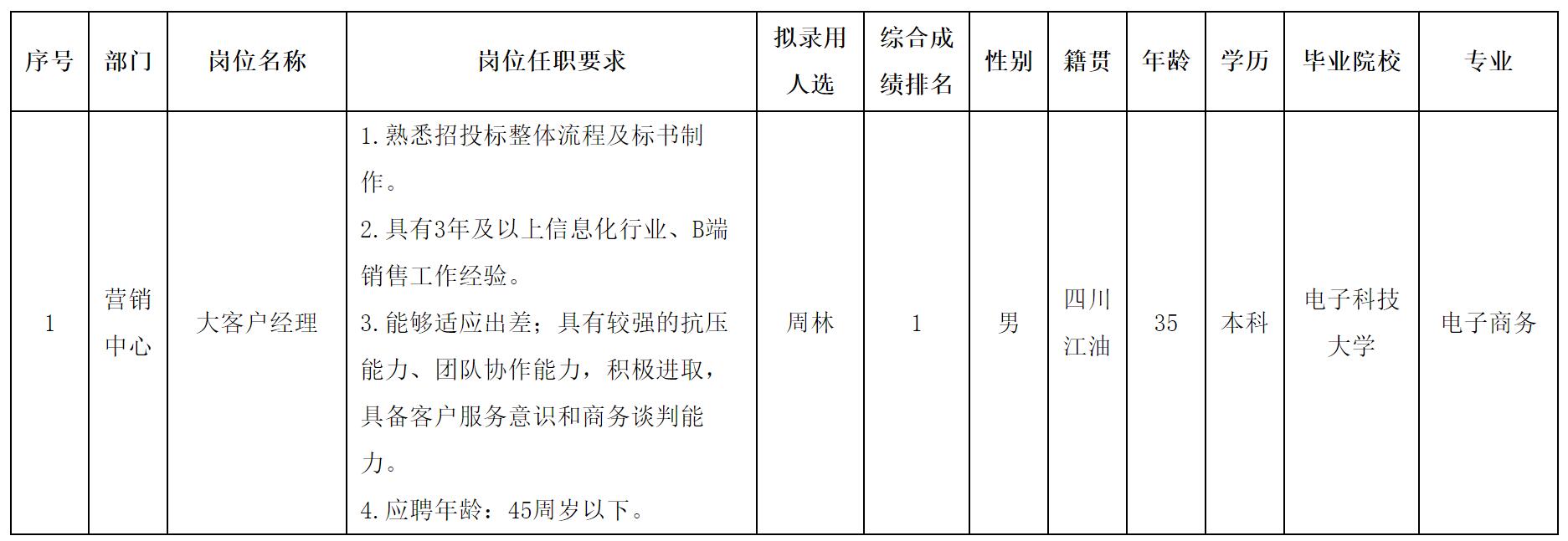 根据四川长虹教育科技有限公司发布的招聘公告及招聘相关规定,经面试等程序,拟录用周林同志到我公司工作,现予以公示,具体情况如下: