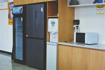 汉仙桥社区综合服务中心“骑手驿站”里,微波炉、冰箱、净水机等设施设备齐全。李静洁 摄