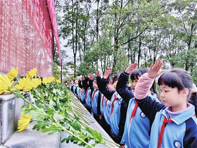 在江油市西山烈士陵园,学生们向英烈致敬。 记者 宋德平 摄