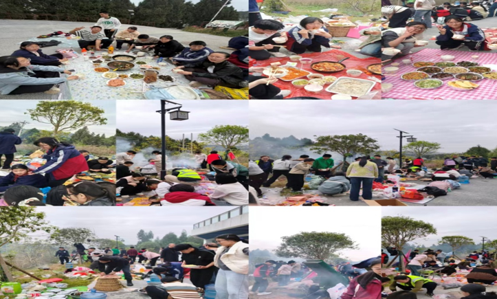 抵达后,师生们迅速分组协作。同学们垒灶台、拾柴火、洗菜切菜、掌勺烹饪,分工有序、配合默契 。生火时虽遇小波折,但大家互帮互助、反复尝试,最终炊烟袅袅升起,锅铲碰撞声与欢笑声交织。鲜辣火㶽、美味烧烤、金黄炒蛋、翠绿时蔬、清香滑等佳肴陆续出锅,大家围坐分享劳动成果,脸上满是满足 。