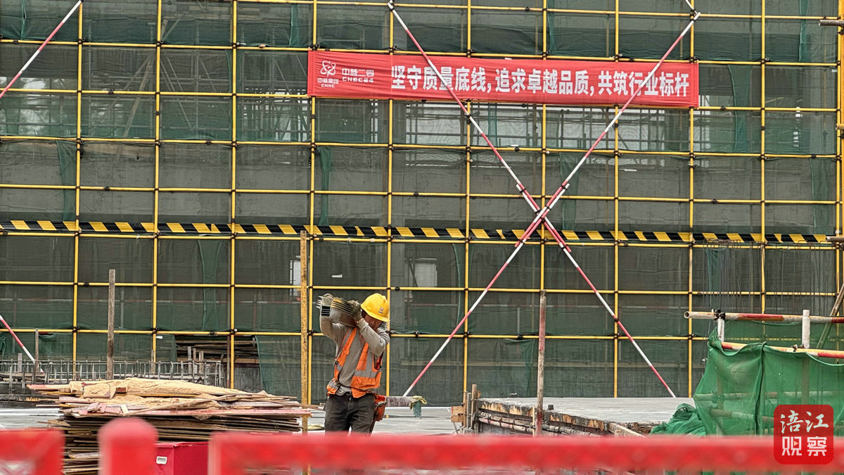 施工现场,9栋高层住宅已拔地而起,塔吊、吊车、天泵等10余台大型设备正开足马力运转。高峰期时,近500名工人同时作业,钢筋工、木工、架子工分工明确,绑扎钢筋、搭建模板、浇筑混凝土……每一道工序都紧密衔接。