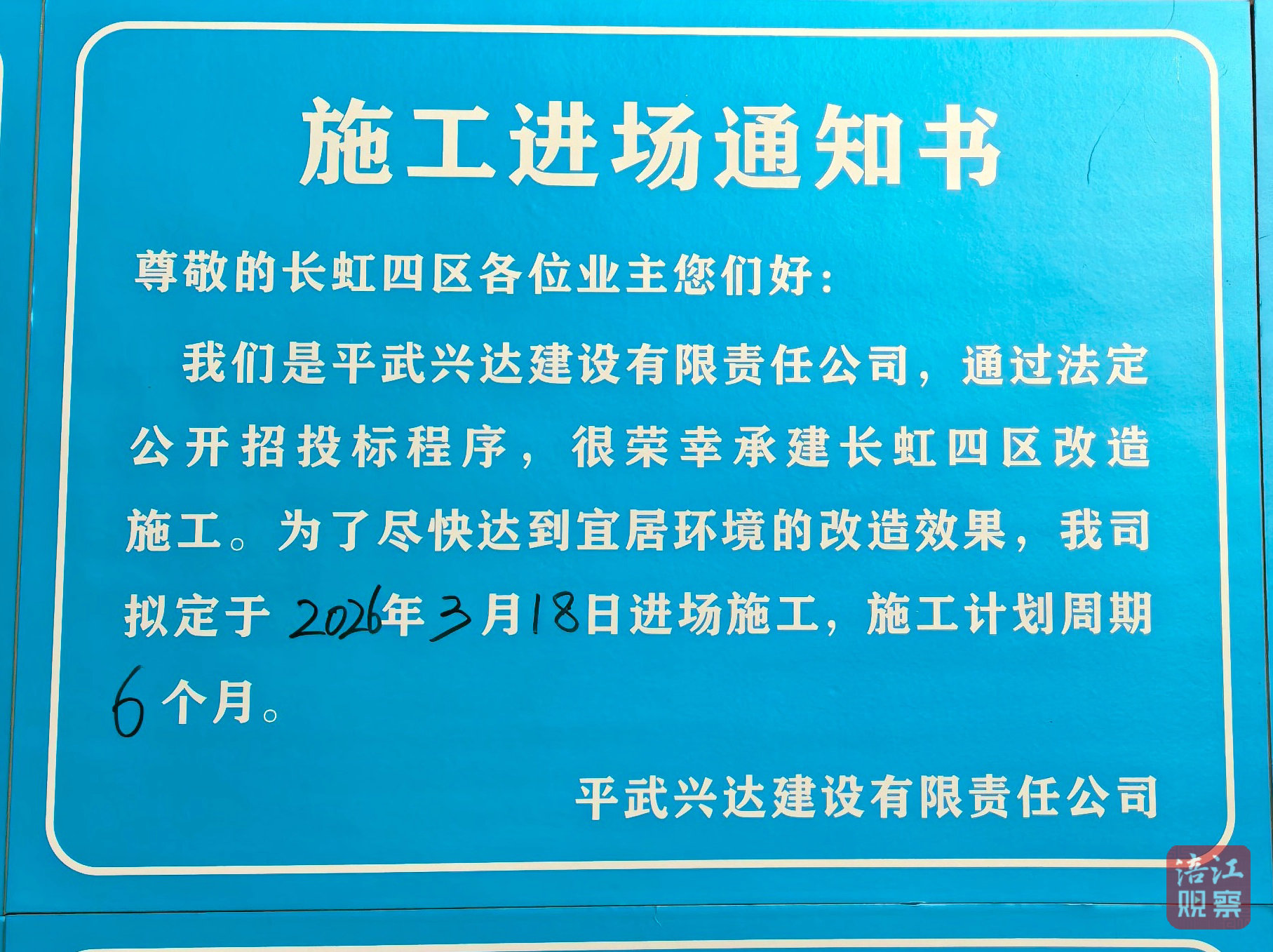 记者注意到,现场施工告示显示,施工单位为平武兴达建设有限公司,改造内容涵盖室外改造、雨水沟、燃气、围墙等工程,目前正进行地面及雨污水管网改造。“施工计划周期”一栏未注明具体时间。
