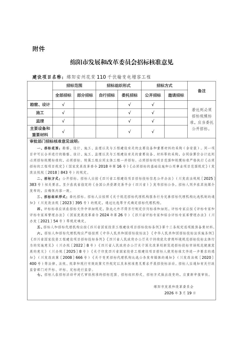 绵阳市发展和改革委员会关于绵阳安州花荄110千伏输变电增容工程项目核准的批复