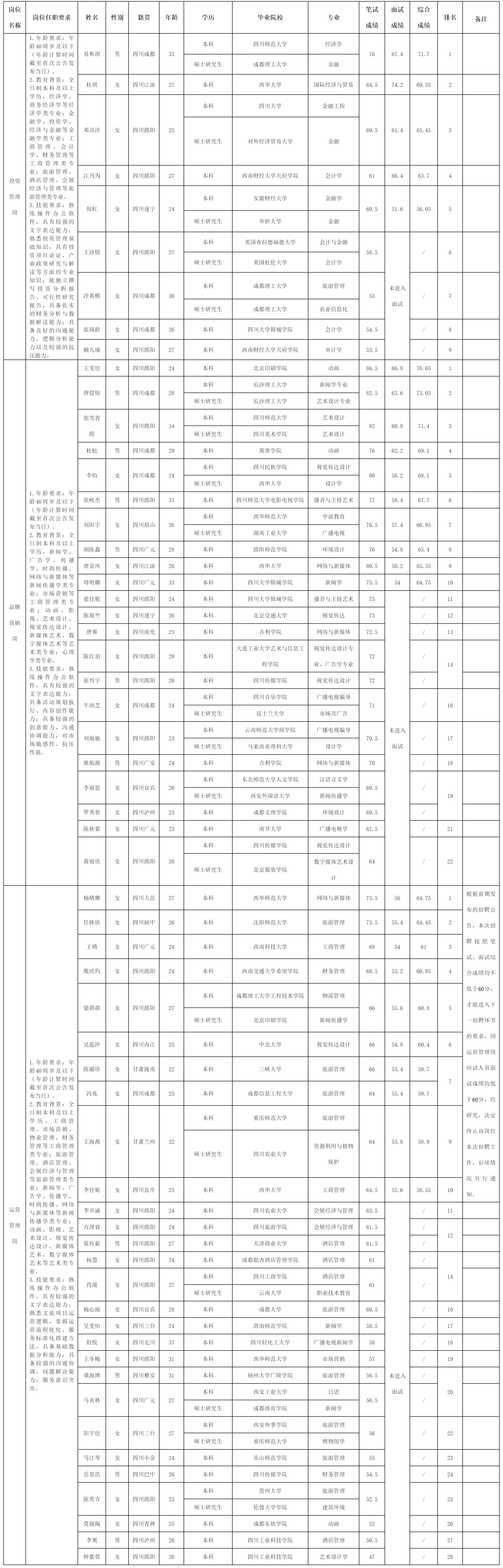 根据绵阳文化旅游发展投资集团有限公司发布的招聘公告及招聘相关规定,经笔试、面试等程序,现将笔试(面试)成绩予以公示。