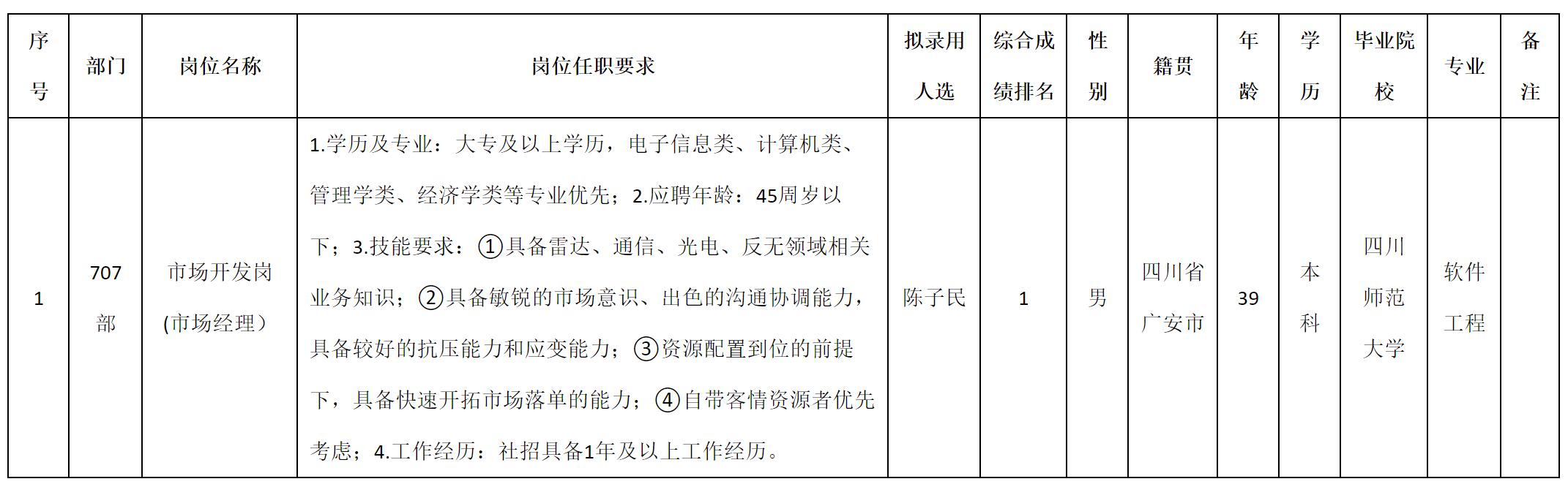 根据四川九洲电器集团有限责任公司发布的招聘公告及招聘相关规定,经测试、考察、体检等程序,拟录用陈子民同志到四川九洲电器集团有限责任公司工作,现予以公示,具体情况如下: