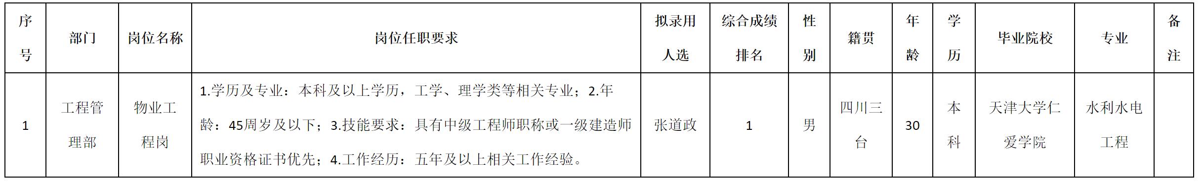 根据四川九洲千城商业管理有限公司发布的招聘公告及招聘相关规定,经测试、考察、体检等程序,拟录用张道政同志到四川九洲千城商业管理有限公司工作,现予以公示,具体情况如下: