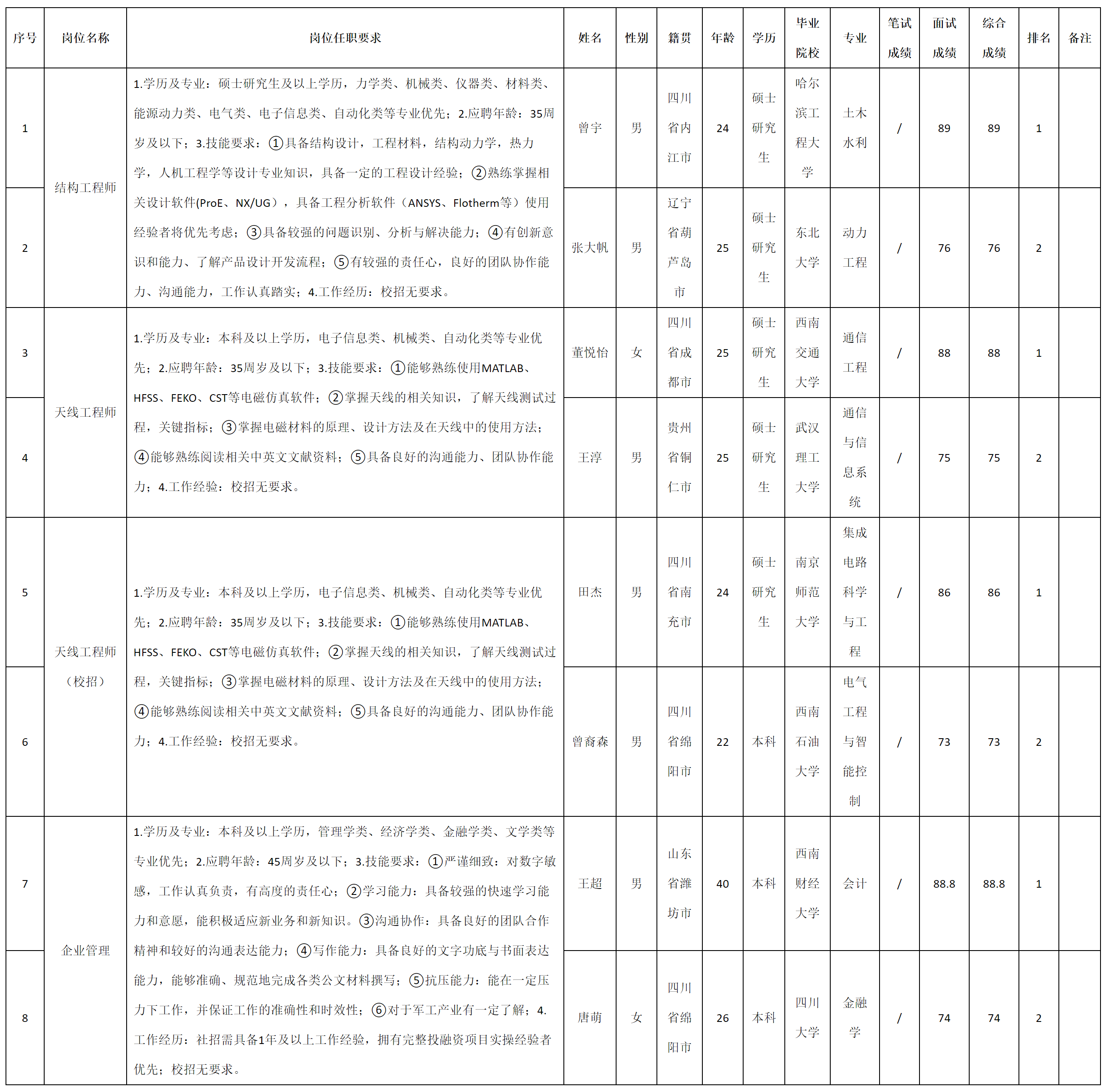 根据四川九洲电器集团有限责任公司发布的招聘公告及招聘相关规定,现将测试成绩予以公示。