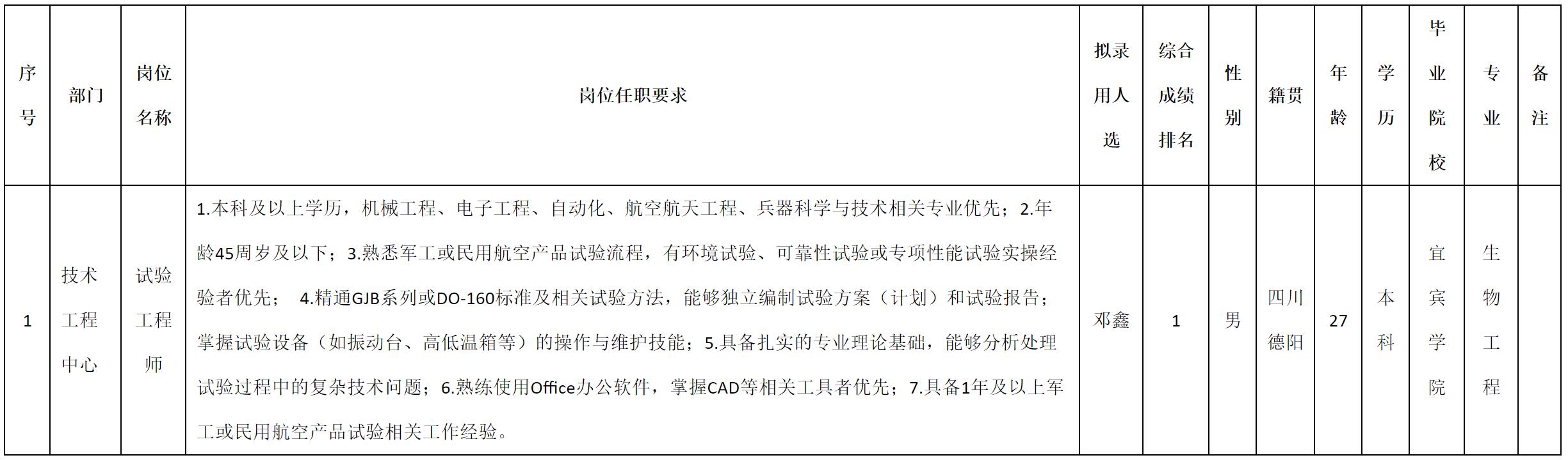根据四川九洲光电科技股份有限公司发布的招聘公告及招聘相关规定,经测试、考察、体检等程序,拟录用邓鑫同志到四川九洲光电科技股份有限公司工作,现予以公示,具体情况如下: