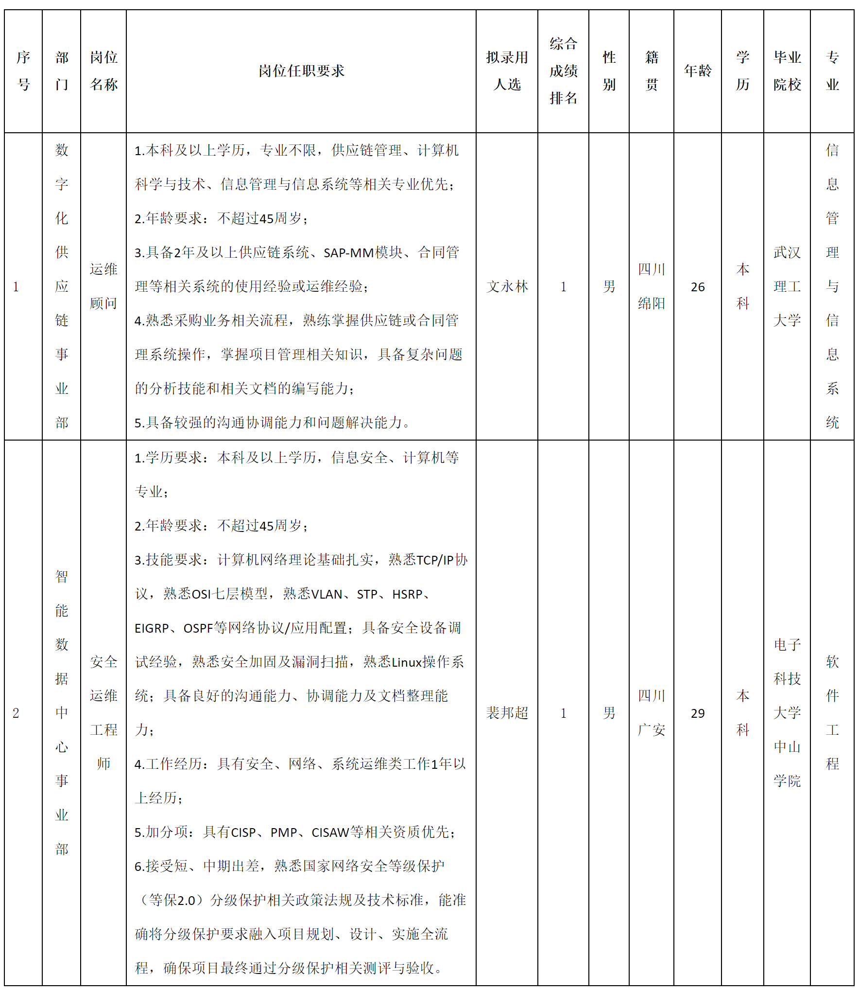根据四川虹信软件股份有限公司发布的招聘公告及招聘相关规定,经测试、考察、体检等程序,拟录用文永林、裴邦超同志到四川虹信软件股份有限公司工作,现予以公示,具体情况如下: