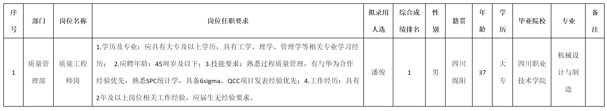 根据四川九华光子通信技术有限公司发布的招聘公告及招聘相关规定,经测试、考察、体检等程序,拟录用潘俊同志到四川九华光子通信技术有限公司工作,现予以公示,具体情况如下: