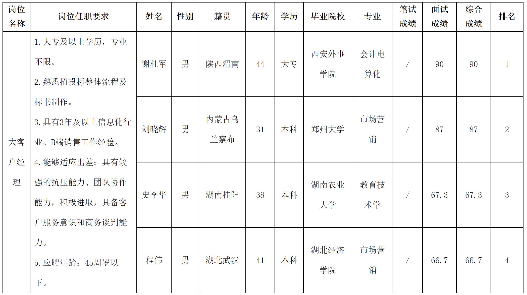 根据四川长虹教育科技有限公司发布的招聘公告及招聘相关规定,经面试等程序,现将测试成绩予以公示。