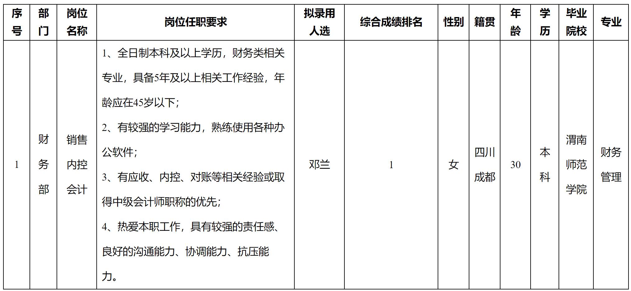根据四川长虹电源股份有限公司发布的招聘公告及招聘相关规定,经测试、考察、体检等程序,拟录用邓兰同志到我司工作,现予以公示,具体情况如下: