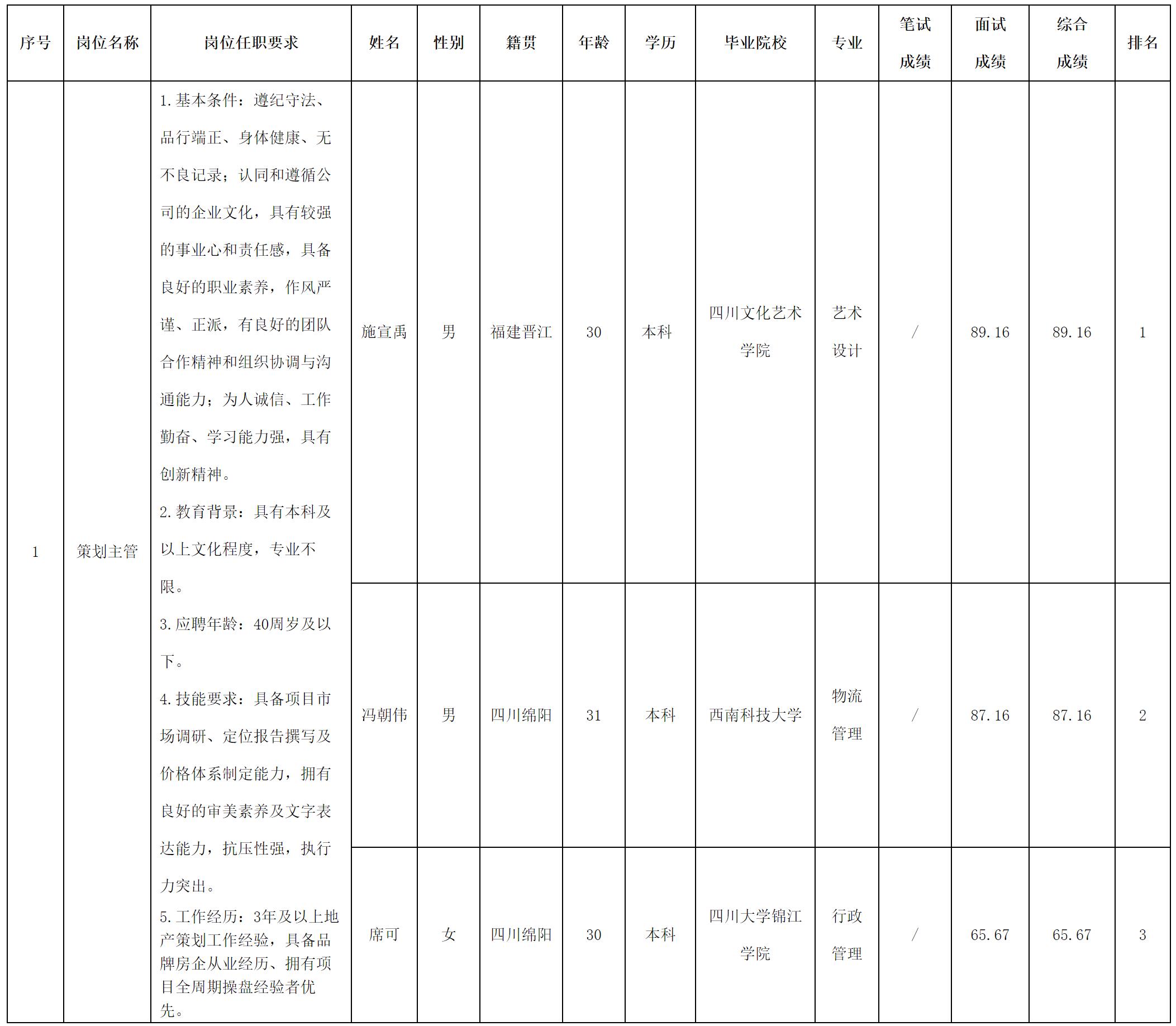 根据四川长虹置业有限公司发布的招聘公告及招聘相关规定,经面试等程序,现将测试成绩予以公示。