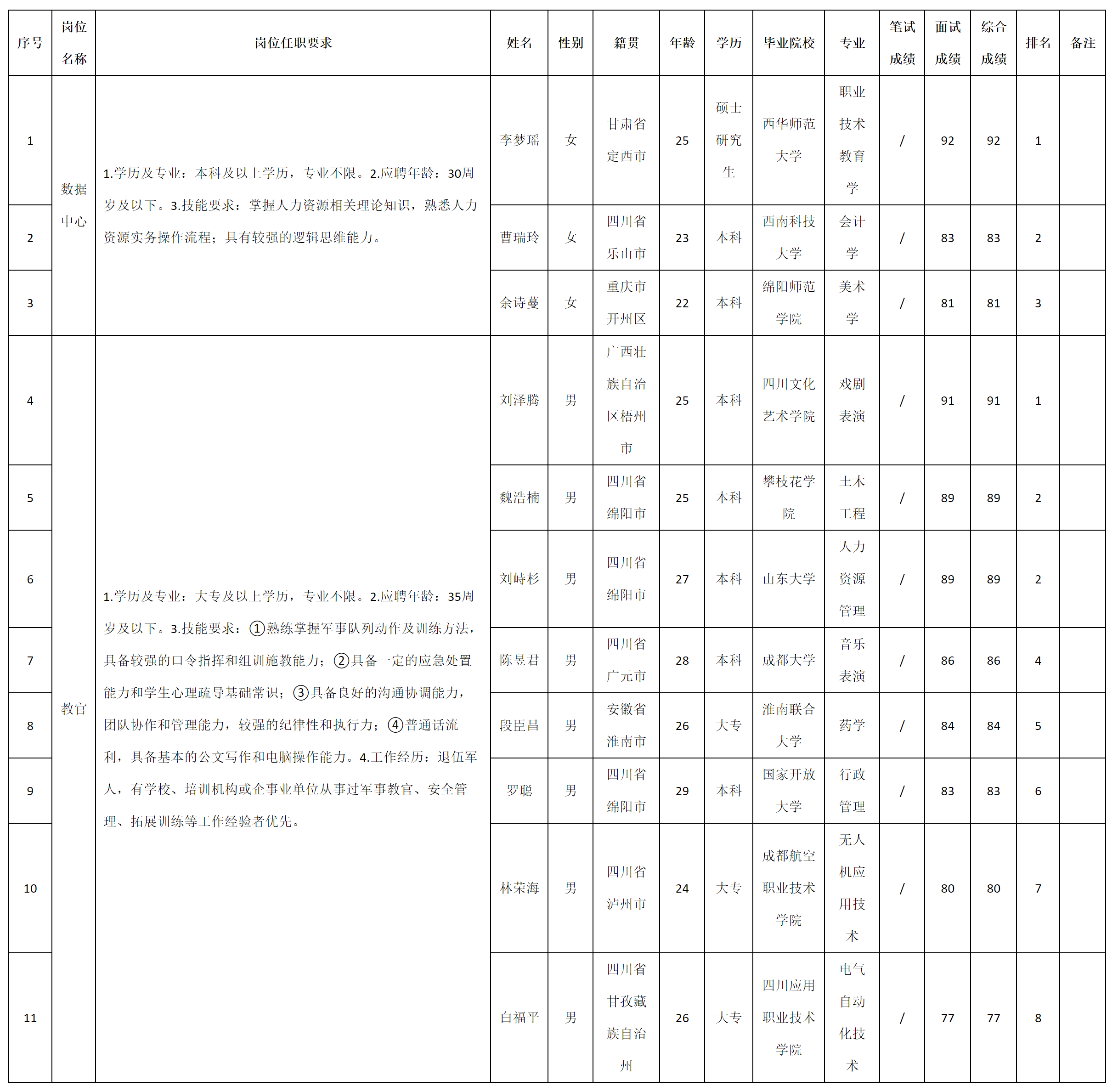 根据四川九洲教育投资管理有限公司发布的招聘公告及招聘相关规定,现将测试成绩予以公示。