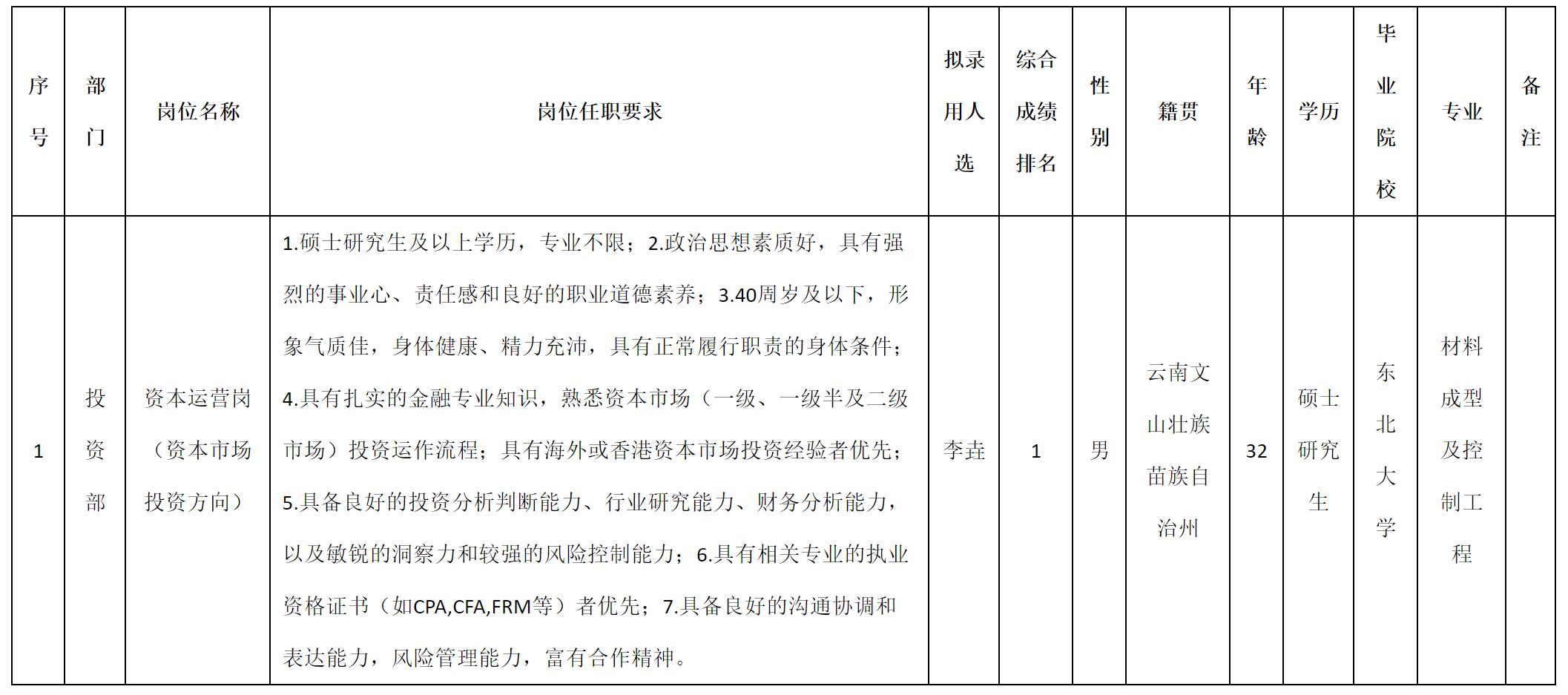 根据四川九洲创业投资有限责任公司发布的招聘公告及招聘相关规定,经测试、考察、体检等程序,拟录用李垚同志到四川九洲创业投资有限责任公司工作,现予以公示,具体情况如下: