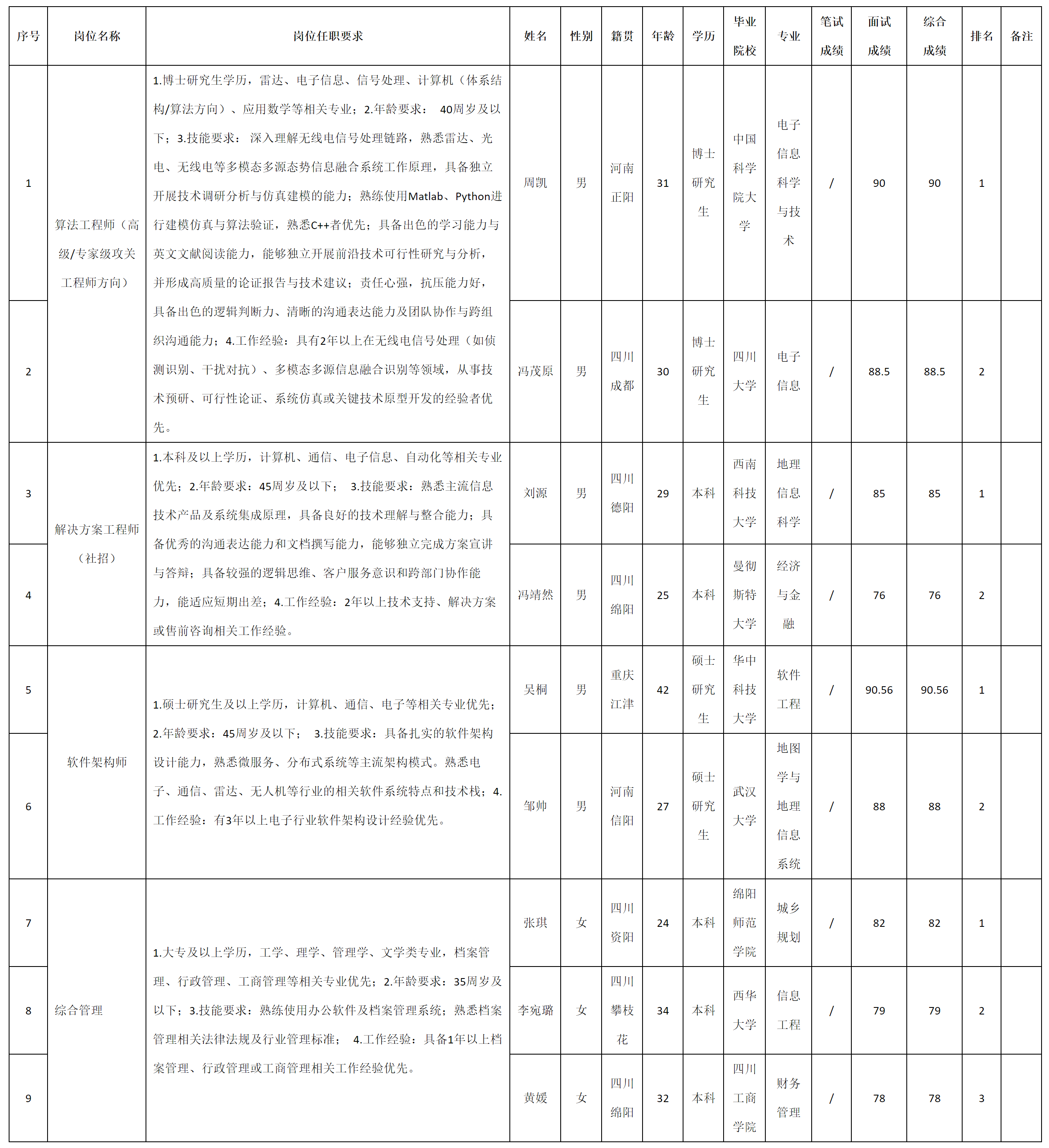 根据四川九洲防控科技有限责任公司发布的招聘公告及招聘相关规定,现将测试成绩予以公示。