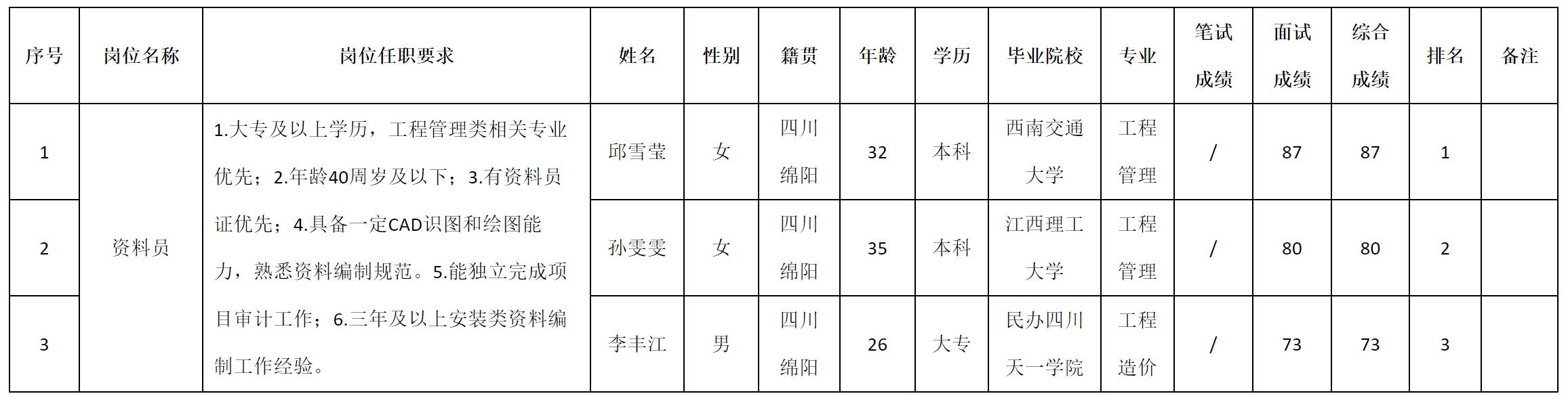 根据四川九洲光电科技股份有限公司发布的招聘公告及招聘相关规定,现将测试成绩予以公示。
