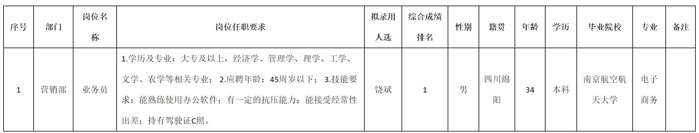 根据四川九洲环保科技有限责任公司发布的招聘公告及招聘相关规定,经测试、考察、体检等程序,拟录用饶斌同志到四川九洲环保科技有限责任公司工作,现予以公示,具体情况如下: