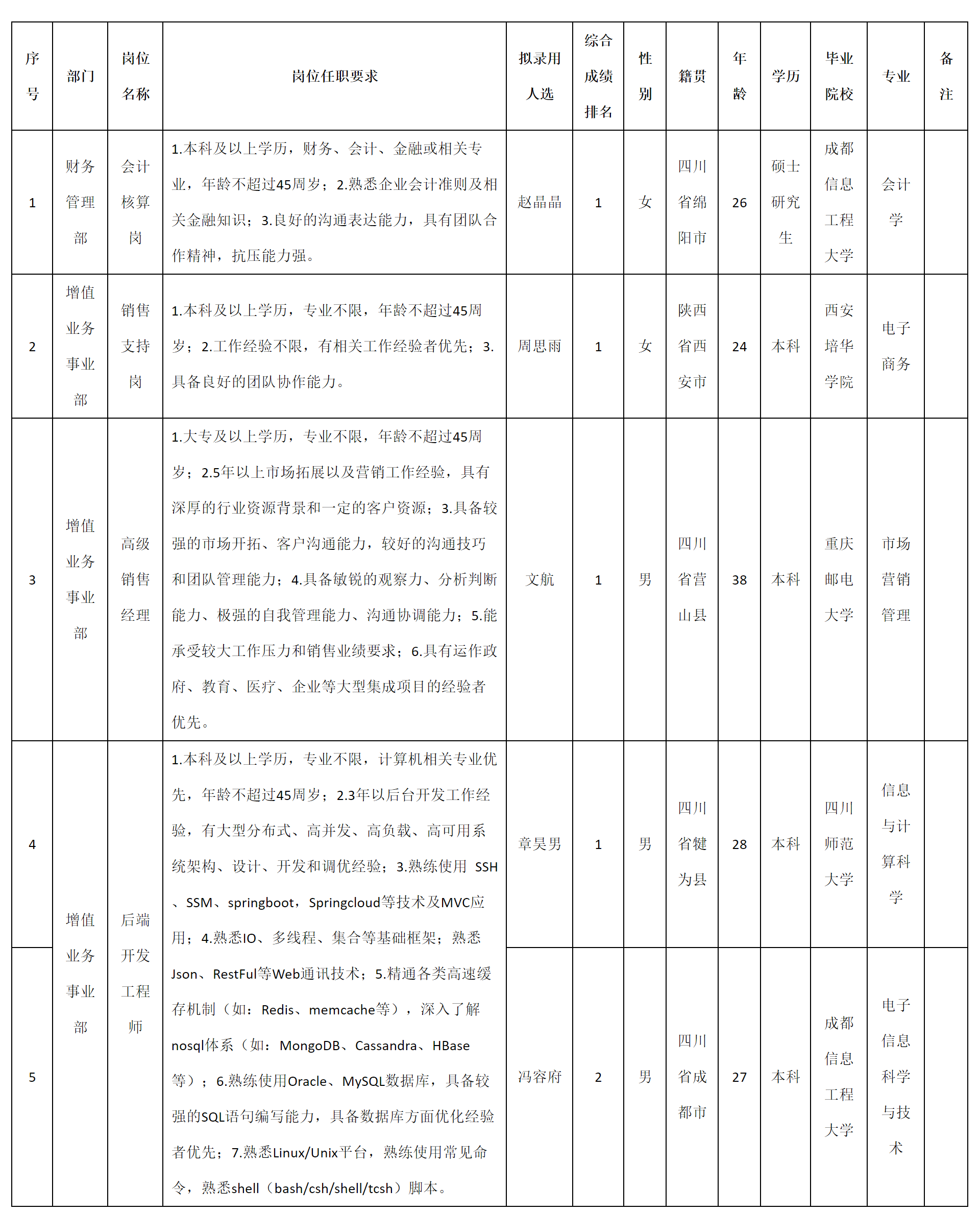 根据四川科瑞软件有限责任公司发布的招聘公告及招聘相关规定,经测试、考察、体检等程序,拟录用赵晶晶等5名同志到四川科瑞软件有限责任公司工作,现予以公示,具体情况如下: