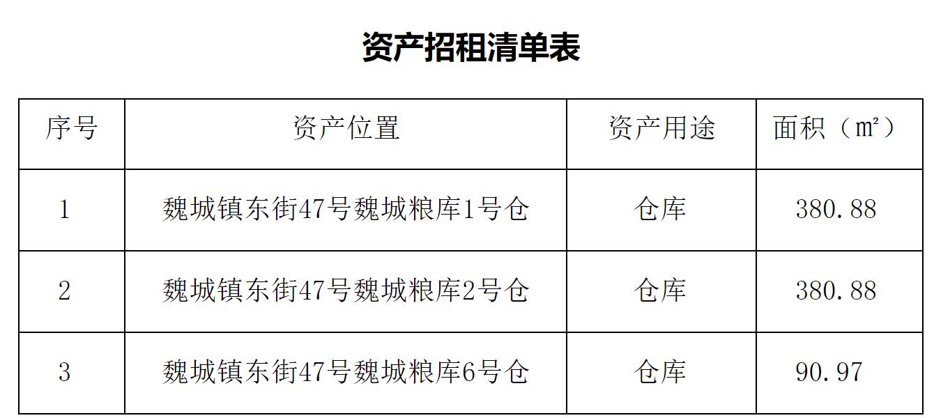 绵阳市储备粮管理有限公司现将代管的魏城粮库部分仓库面向社会进行公开竞价招租(详见《资产招租清单表》),现将有关事宜公告如下: