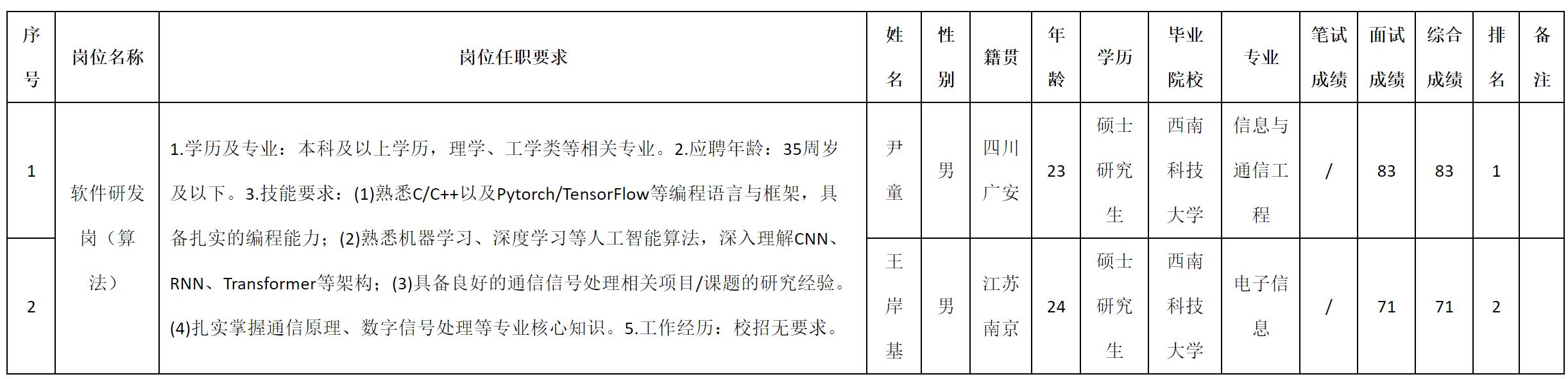 根据四川九强通信科技有限公司发布的招聘公告及招聘相关规定,现将测试成绩予以公示。