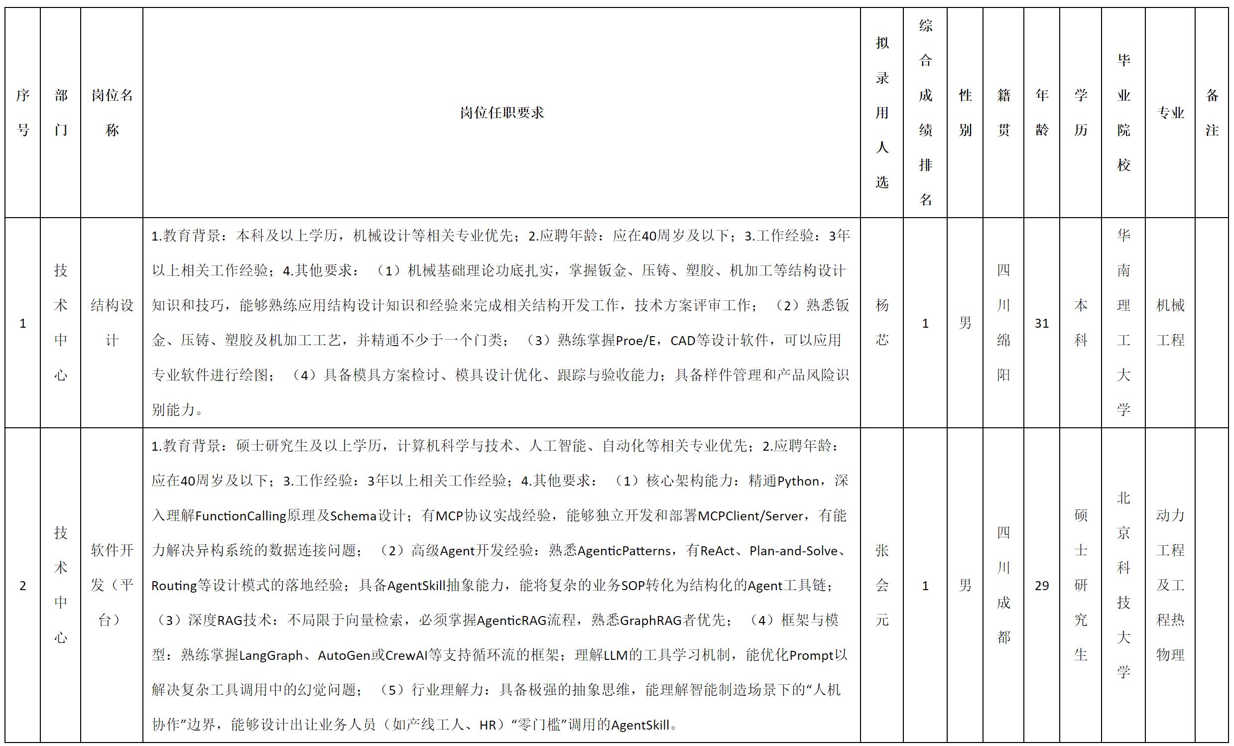根据四川九州电子科技股份有限公司发布的招聘公告及招聘相关规定,经测试、考察、体检等程序,拟录用杨芯等2名同志到四川九州电子科技股份有限公司工作,现予以公示,具体情况如下: