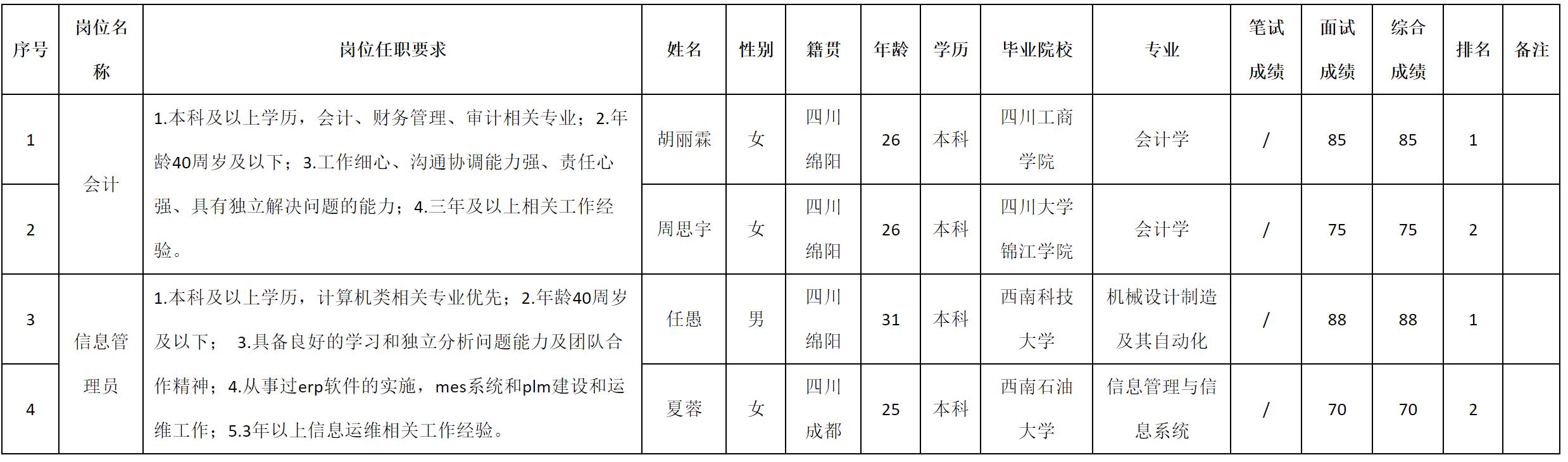 根据四川九洲光电科技股份有限公司发布的招聘公告及招聘相关规定,现将测试成绩予以公示。