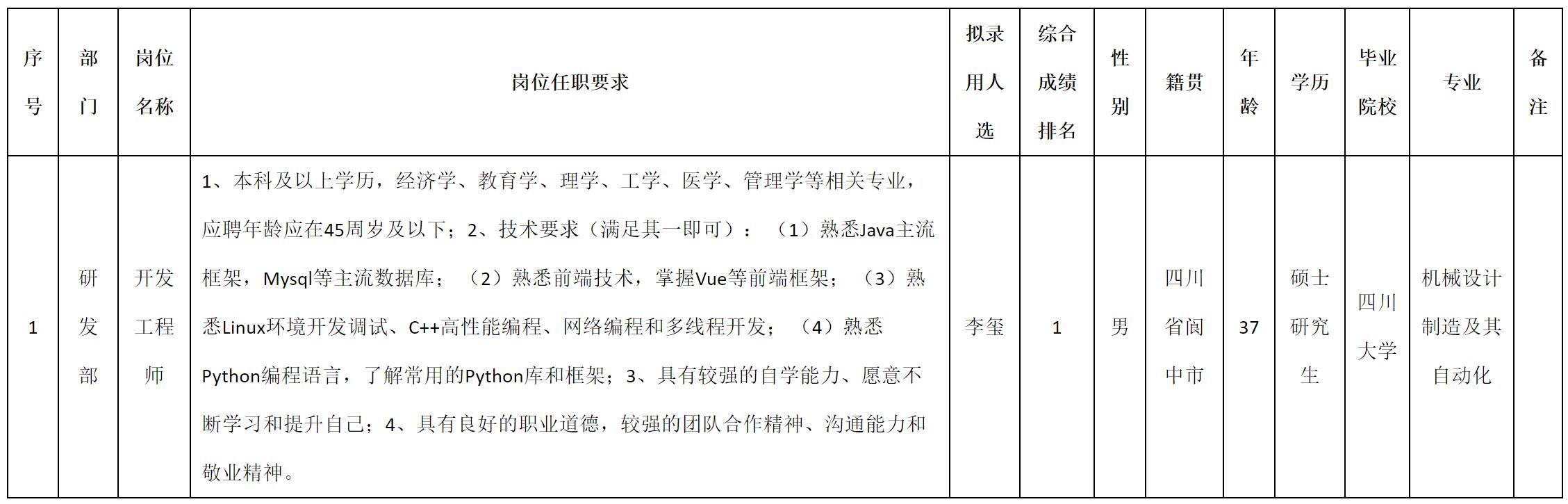 根据四川九洲投资控股集团有限公司软件与数据智能产业发布的招聘公告及招聘相关规定,经测试、考察、体检等程序,拟录用李玺同志到四川九洲投资控股集团有限公司软件与数据智能产业工作,现予以公示,具体情况如下: