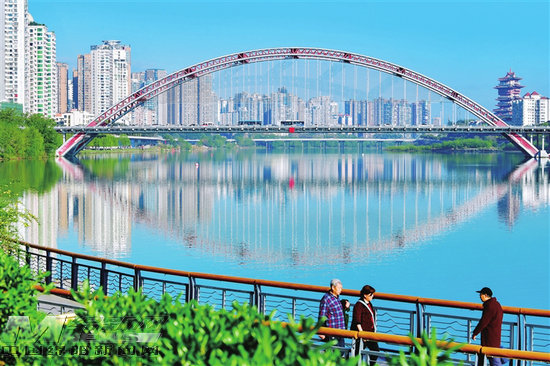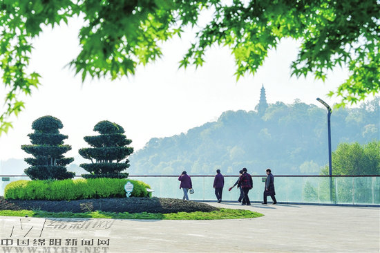 市民漫步三江半岛,与远处的富乐大桥和高楼相映成景。