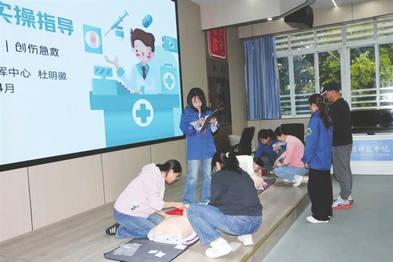 参训教师进行急救实操练习。 记者 彭雪 摄