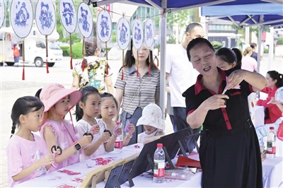 在新时代文明实践活动中,小朋友们体验非遗剪纸。
