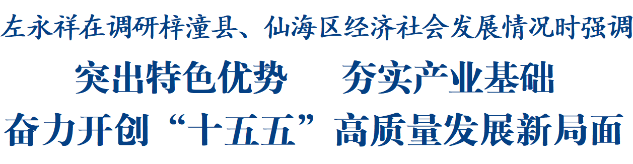 调研过程中,左永祥听取了梓潼县、仙海区经济社会发展情况以及换届工作情况汇报,对取得的工作成效给予肯定。他指出,梓潼县和仙海区在绵阳发展大局中具有重要地位,要完整准确全面贯彻新发展理念,全力以赴拼经济、搞建设,千方百计惠民生、保安全,推动经济实现量质齐升、稳中有进,努力为全市发展大局多作贡献。梓潼县要立足本地特色优势,坚持创新驱动,统筹推动优势产业延链、传统产业升级、新兴产业建链,因地制宜构建现代化产业体系;深入挖掘“文昌文化”和“两弹一星”精神内涵,推进文旅深度融合并与其他产业联动发展,着力培育新的经济增长点;扎实推进城乡融合发展,对标先进地区,加强城市精细化管理、持续推动城市品质提升,加快建设宜居宜业和美乡村,更好满足人民群众对美好生活的向往;积极推进闲置低效资产资源盘活利用,更好支撑梓潼经济社会高质量发展。仙海区要依托独特生态资源,做好“水文章”、发展“水经济”,推动生态效益向经济效益、社会效益转化;大力发展低空经济,完善基础设施配套,丰富应用场景,积极构建文化旅游、培训研学、物流配送、应急救援等于一体的低空产业生态圈;顺应数字经济发展趋势,植入更多有市场吸引力、受年轻人喜欢的新业态,更好地把人气流量转化为发展增量。两地要扎实开展树立和践行正确政绩观学习教育,坚决杜绝形象工程、面子工程,坚决落实过紧日子要求,扎实做好县乡领导班子换届各项工作,持续落实好“双提双解”常态化工作机制,自觉做到为人民出政绩、以实干出政绩;统筹好发展和安全,抓实安全生产、食品安全、生态环保等重点工作,常态化开展安全隐患排查整治,切实守牢安全底线,确保社会大局和谐稳定。