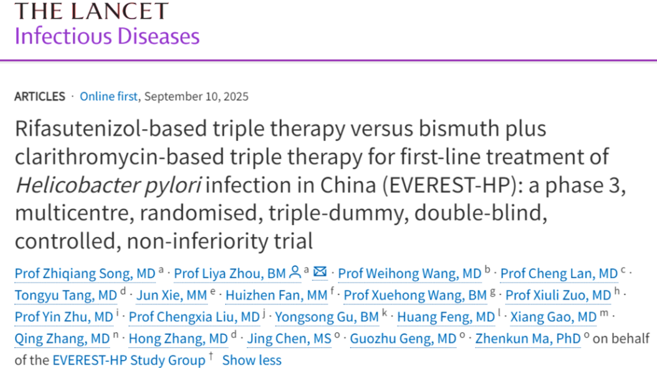 北京大学第三医院消化科周丽雅/宋志强教授团队带领全国40家医疗机构消化疾病诊疗中心研究发现,含利福特尼唑的三联方案,让幽门螺杆菌治疗有望重新回归更简便的三联方案时代,为全球幽门螺杆菌感染者带来了全新的治疗选择。相关成果日前于《柳叶刀-感染病学》在线发表。[