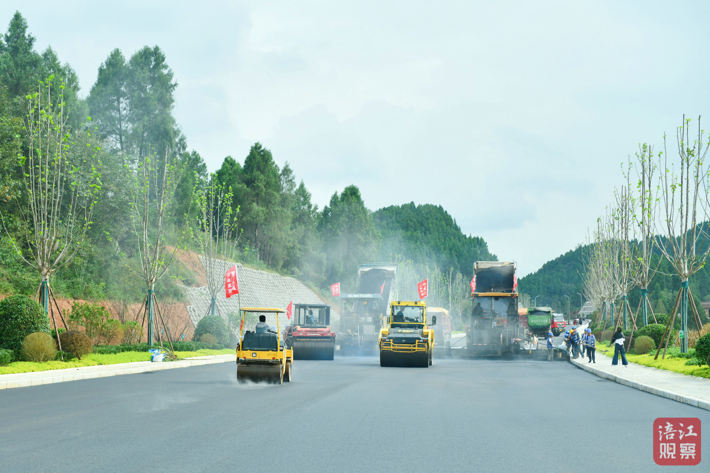 10月14日,在广绵高速扩容项目梓潼段连接线施工现场,摊铺机、压路机等大型机械有序作业,轰鸣声此起彼伏,一派繁忙景象。 [