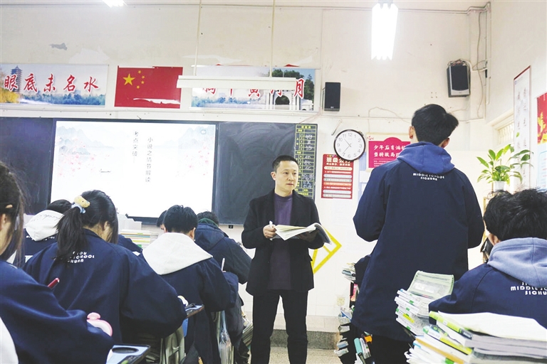 12月5日清晨6时50分,在江油中学校门口,郑继成面带微笑引导学生入校。随后,他匆匆赶往教室,组织高三22班的孩子们开始语文早读。 [