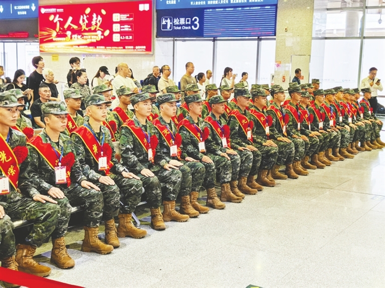 9月18日上午10时,绵阳火车站候车大厅内,一首《歌唱祖国》嘹亮响起。700多名新兵从这里出发,奔向军旅新征程。[