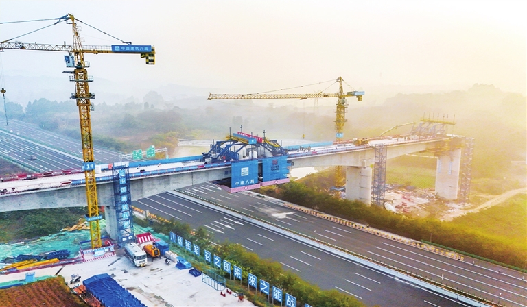 一线探访·项目新进度|凌空“跨”越!绵遂资内铁路全线首座跨高速公路连续梁合龙