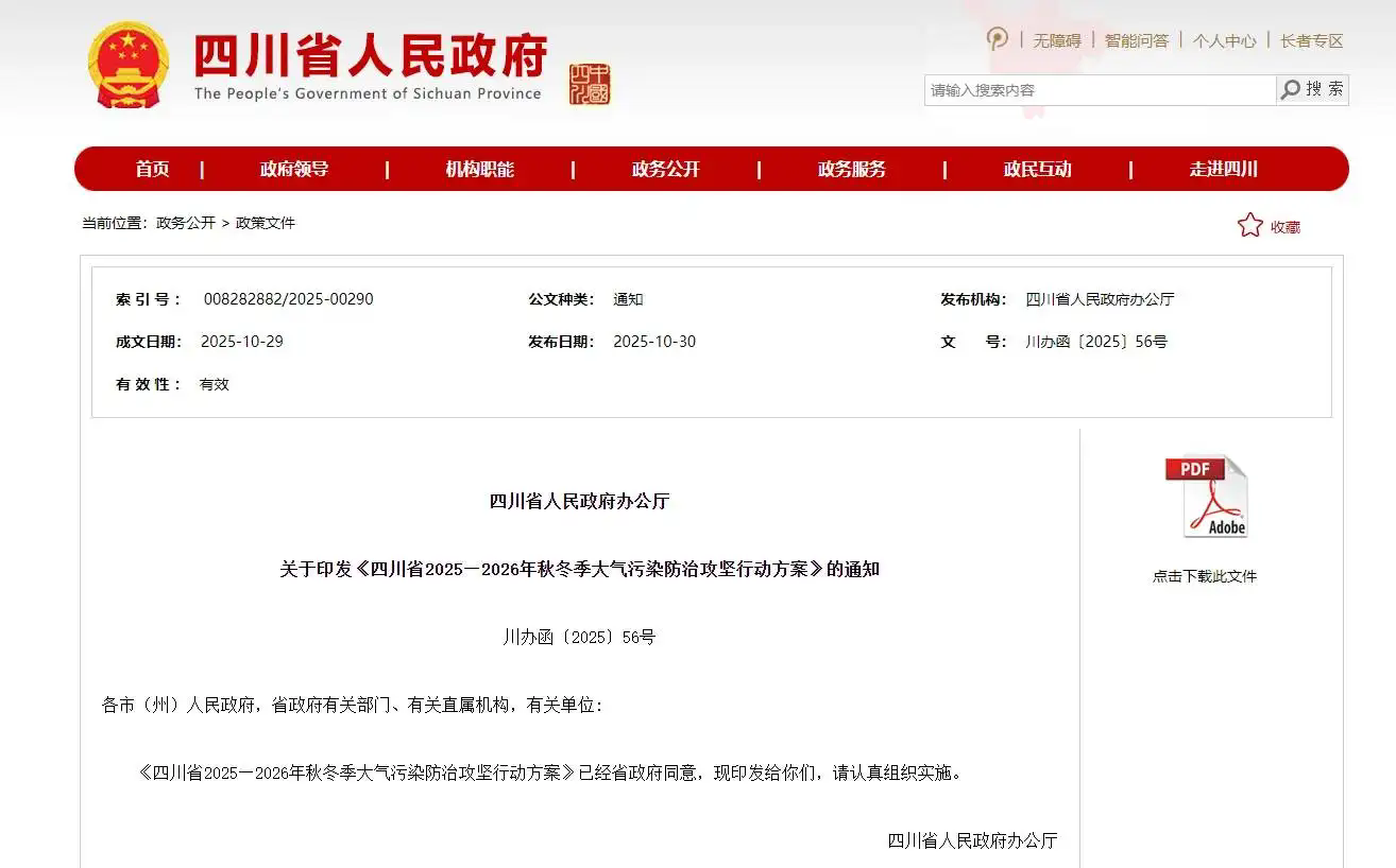 据四川省人民政府网站消息,为全力打好秋冬季大气污染防治攻坚战,高质量完成大气“十四五”收官目标任务,实现“十五五”顺利开局,10月30日,四川省人民政府办公厅印发《四川省2025—2026年秋冬季大气污染防治攻坚行动方案》(以下简称《方案》)。《方案》明确,今年秋冬季..[