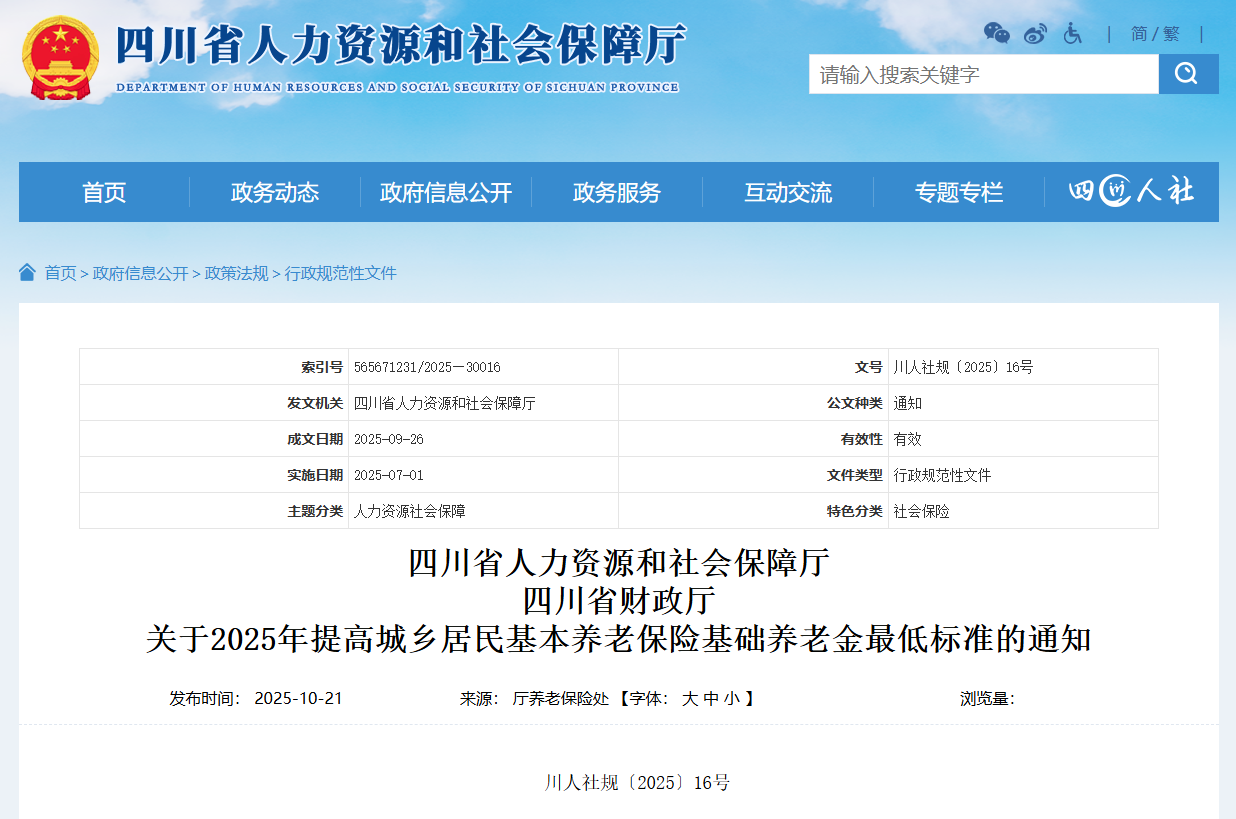 日前,四川省人力资源和社会保障厅、四川省财政厅发布关于2025年提高城乡居民基本养老保险基础养老金最低标准的通知。[