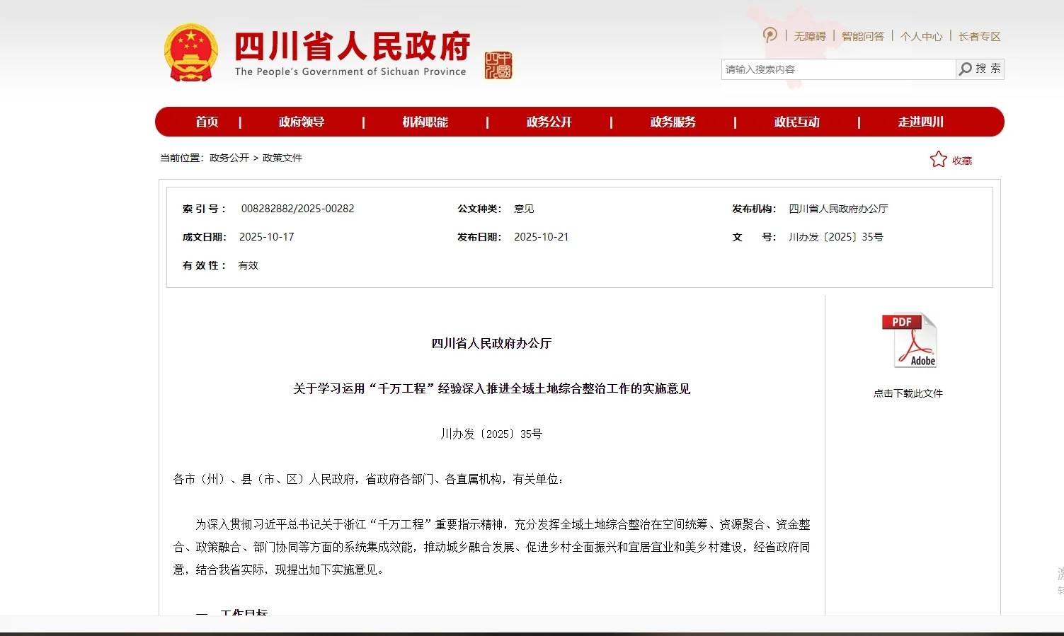 10月21日,四川省人民政府办公厅印发《关于学习运用“千万工程”经验深入推进全域土地综合整治工作的实施意见》(以下简称《实施意见》),旨在充分发挥全域土地综合整治效能,推动城乡融合发展、促进乡村全面振兴与宜居宜业和美乡村建设。《实施意见》为未来几年四川全域土地..[